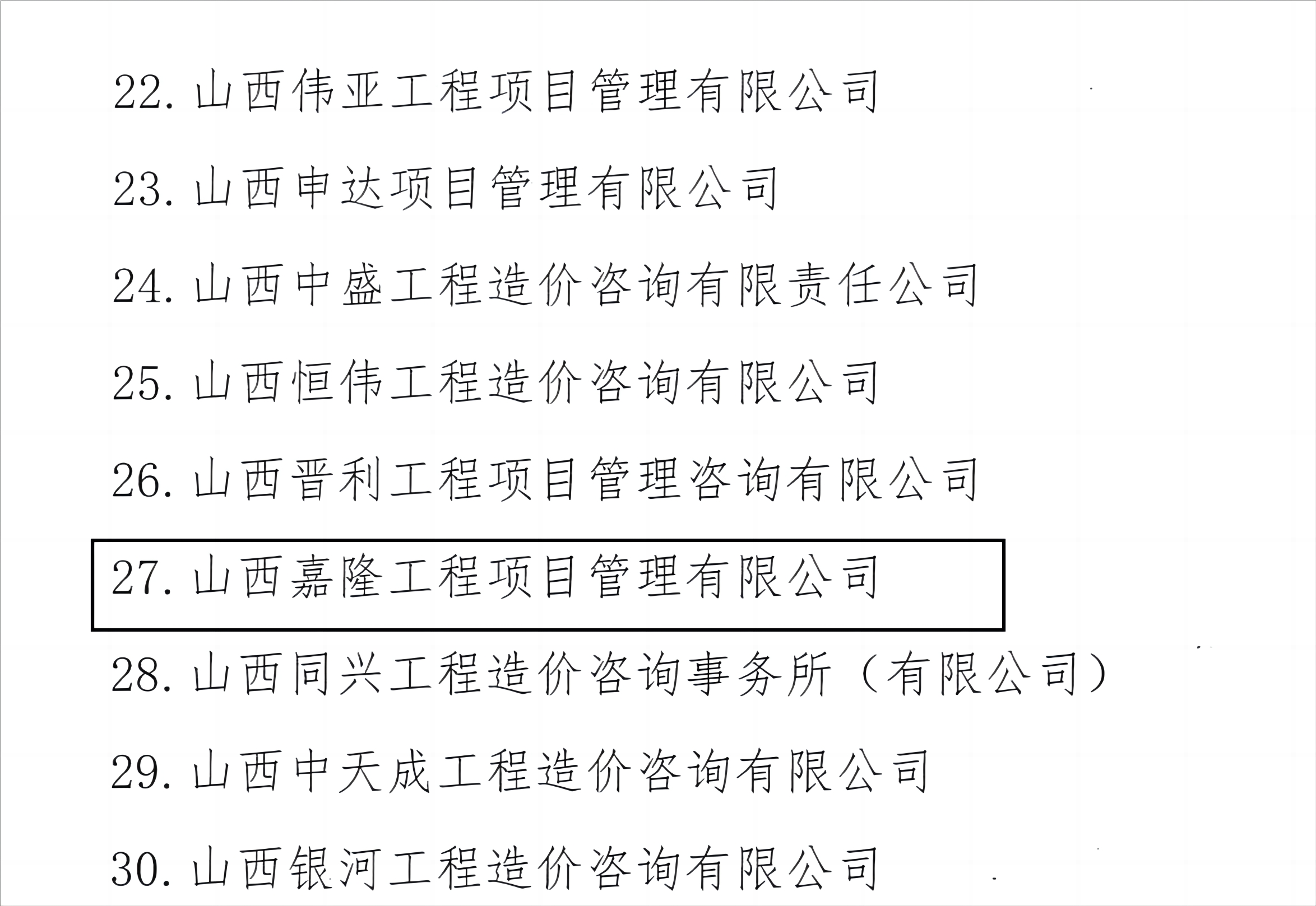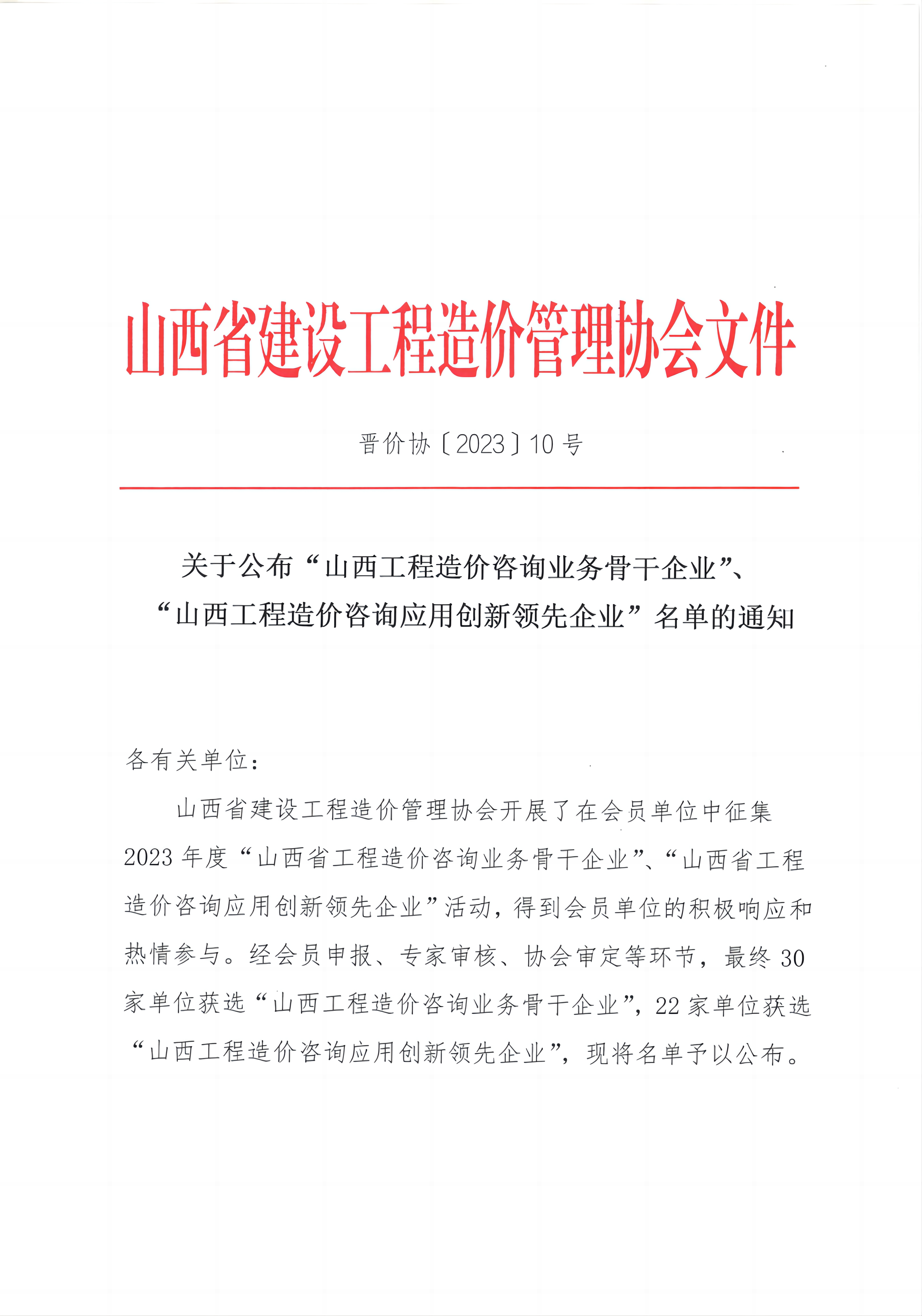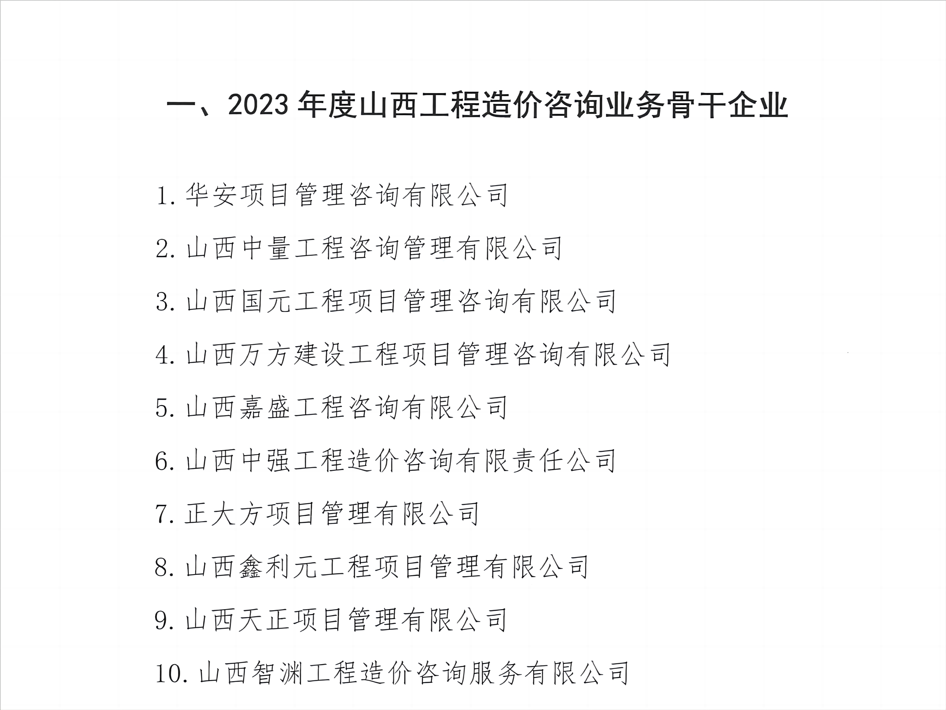2023年,省價(jià)協(xié)開展2023年度“山西省工程造價(jià)咨詢業(yè)務(wù)骨干企業(yè)”、“山西省工程造價(jià)咨詢應(yīng)用創(chuàng)新領(lǐng)先企業(yè)"活動,我公司積極參與申報(bào),經(jīng)省價(jià)協(xié)初審、專家評審,最終,我公司入選2023年度“山西省工程造價(jià)咨詢業(yè)務(wù)骨干企業(yè)”。